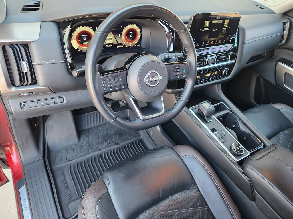 Scarlet Ember Tintcoat 2023 Nissan Pathfinder Platinum 4WD 9-Speed Automatic V6 4WD.Odometer is 10535 miles below market average!Cargo Package (Cargo Area Protector, Cargo Net, and First Aid Kit), 4WD, 13 Speakers, 3rd row seats: bench, 4-Wheel Disc Brakes, ABS brakes, Air Conditioning, Alloy wheels, AM/FM radio: SiriusXM, Auto High-beam Headlights, Auto tilt-away steering wheel, Auto-dimming Rear-View mirror, Automatic temperature control, Axle Ratio: 4.334, Bench Seat Carpeted Floor Mats (Set of 4), Black Splash Guards (Set of 4), Bodyside moldings, Bose Premium Audio System, Brake assist, Bumpers: body-color, Cross Bars, Delay-off headlights, Driver door bin, Driver vanity mirror, Dual front impact airbags, Dual front side impact airbags, Electronic Stability Control, Emergency communication system: NissanConnect Services, Exterior Parking Camera Rear, Four wheel independent suspension, Front anti-roll bar, Front Bucket Seats, Front Center Armrest, Front dual zone A/C, Front reading lights, Fully automatic headlights, Garage door transmitter: HomeLink, Heads-Up Display, Heated & Cooled Front Bucket Seats, Heated door mirrors, Heated front seats, Heated rear seats, Heated steering wheel, Illuminated entry, Knee airbag, Leather steering wheel, LED Fog Lamps, Low tire pressure warning, Memory seat, Navigation system: NissanConnect Navigation, NissanConnect w/Navigation & Services, Occupant sensing airbag, Outside temperature display, Overhead airbag, Overhead console, Panic alarm, Passenger door bin, Passenger vanity mirror, Power door mirrors, Power driver seat, Power Liftgate, Power moonroof, Power passenger seat, Power steering, Power windows, Radio data system, Radio: AM/FM Audio System, Rain sensing wipers, Rear air conditioning, Rear anti-roll bar, Rear reading lights, Rear seat center armrest, Rear side impact airbag, Rear window defroster, Rear window wiper, Reclining 3rd row seat, Remote keyless entry, Security system, Semi-Aniline Leather Seating Surfaces, Speed control, Speed-sensing steering, Speed-Sensitive Wipers, Split folding rear seat, Spoiler, Steering wheel memory, Steering wheel mounted audio controls, Tachometer, Telescoping steering wheel, Tilt steering wheel, Traction control, Trip computer, Turn signal indicator mirrors, Variably intermittent wipers, Ventilated front seats, and Wheels: 20 Machined Alloy w/Dark Met Gray Finish.